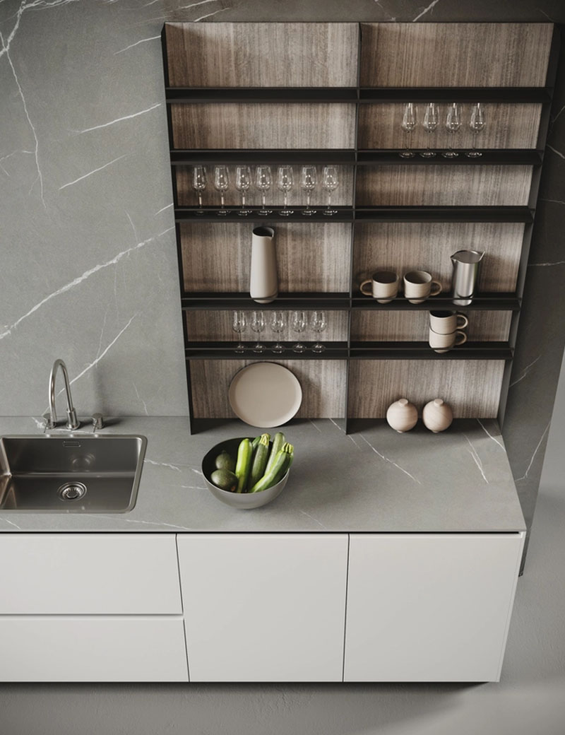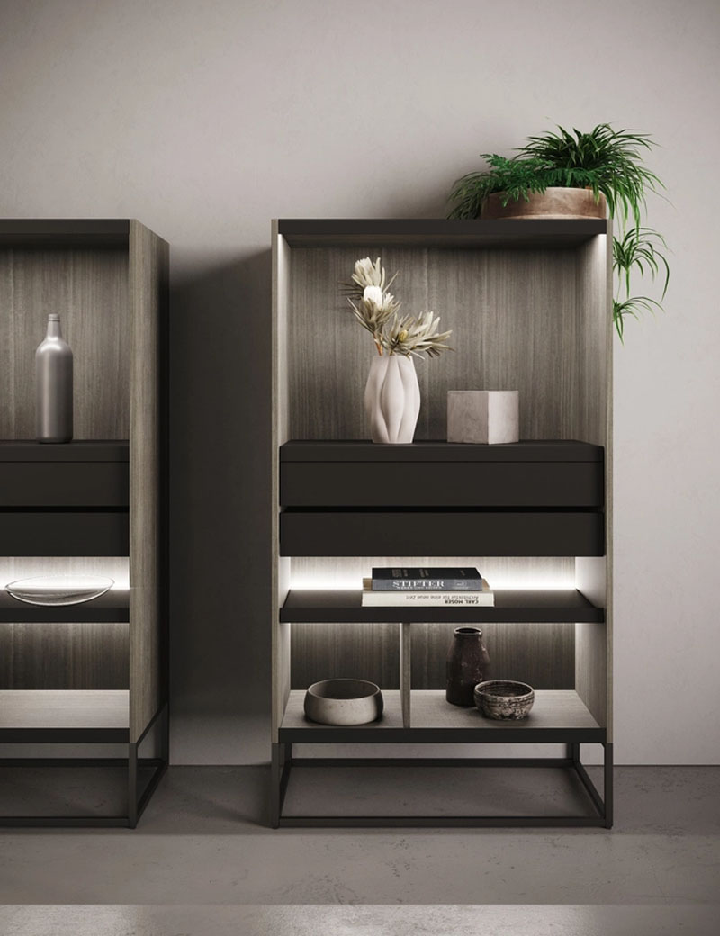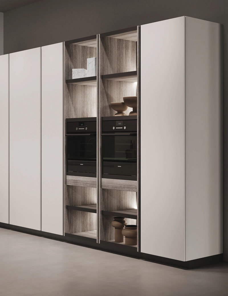 A space to be lived in that combines aesthetics and functionality. Door panels are made with a low-formaldehyde emission particle board panel (Class E1) coated on both sides with melamine foil. ABS edge in color.